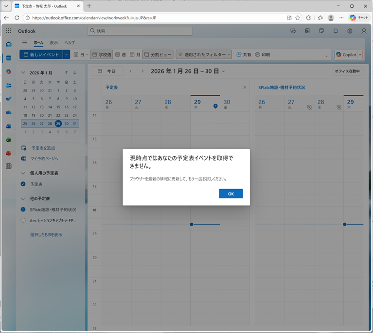 1月27日頃より、Outlook WebやOutlookデスクトップアプリ(新しいOutlook)からのパブリックフォルダ予定表の参照ができない状況が続いています。現在、原因の調査中ですので、解消までしばらくお待ちください。